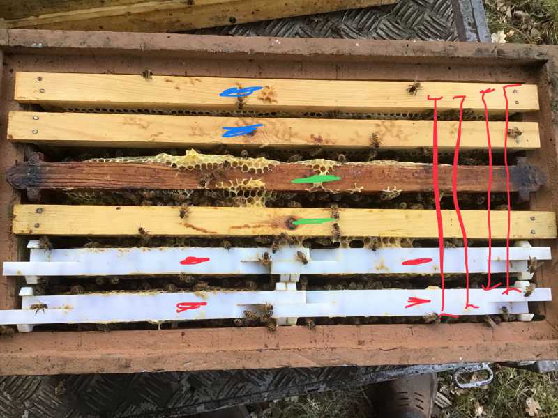 Voilà se qui a bien marché quatre cadres plastique , en rouge pour le départ avec introduction d’une reine vierge , en bleu les premiers cadres de couvain d’une autre ruche en vert les dernières introduit et pondus actuellement , sinon trois cadres de hausses avec couvain operculé et abeilles et introduction en rentrant , puis une hausse dessus avec des cadres de corps pour migrer , si sa évolue pas assez vite pour les dernières je comblerai avec des cadres de tournesol avec des hausses en bois et partitions
