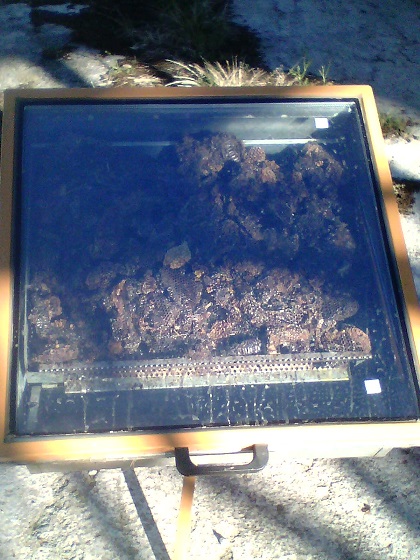 Je profite des 33 ° chez moi pour fondre mes cires noires au cérificateur solaire. Pas glorieux, pour 4.7 kg ( maximum possible de mon appareil ) de cire noire correspondant à environ 10 cadres de corps de ruche dadant, 800 g de cire récupérés.