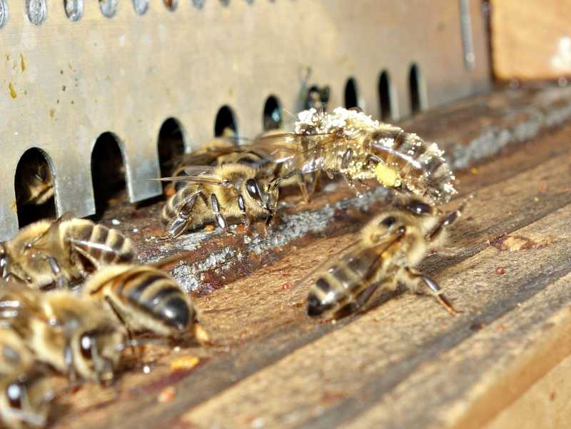 Je ne sais toujours pas d’où elles viennent et quelle est cette substance. Je m’amuse beaucoup à les regarder rentrer à la ruche en faisant des embardées car certaines ont également leurs pattes pleines de pollen