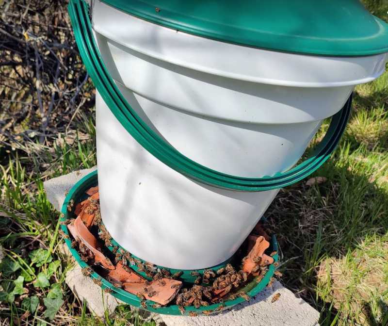 (très souvent dans mon rucher et par expérience cela évite pas mal d’interventions malveillantes).Quand, je suis aux ruchers, utilisation de mon jerrican de 20 litres d’eau pour faire l’appont.