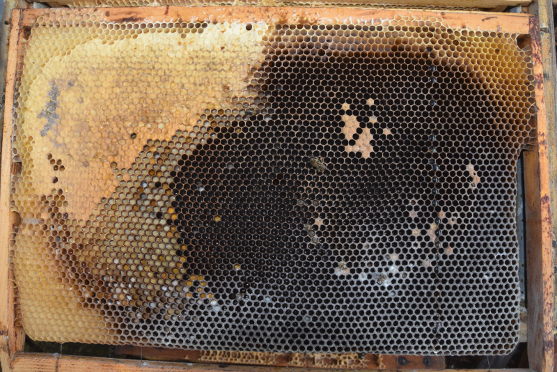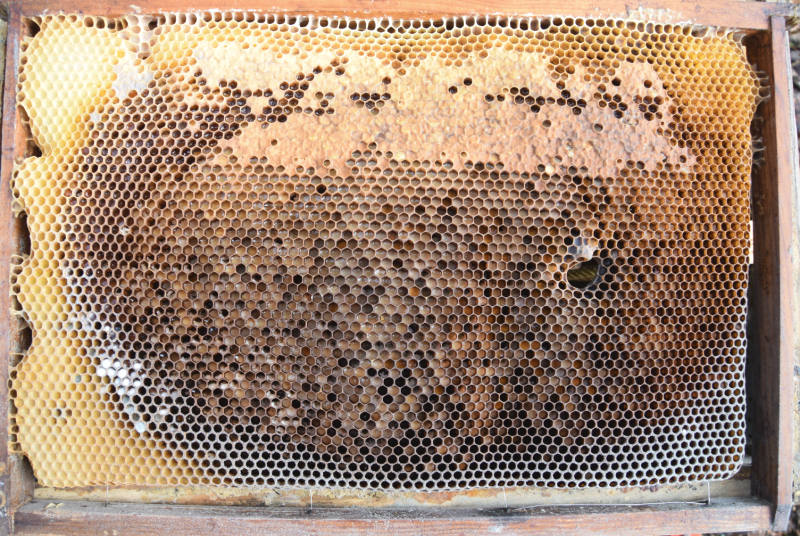 Non je n’ai pas montré tout les cadres, il y a plusieurs cadres de provision, mais certe les provisions sont plus attaquées que les autres ruches mortes, mais c’est aussi la dernière morte, je l’ai constaté en rentrant apres 4 semaines d’absence, en decembre elle avait encore des abeilles au trou du couvre cadre qd j’ai placé le pain de candi. Mais le moisi a du s’installer avec l’humidité, ils n’y en avait pas sur les autres que j’ai remisé des que j’ai consaté leur mort debut decembre.