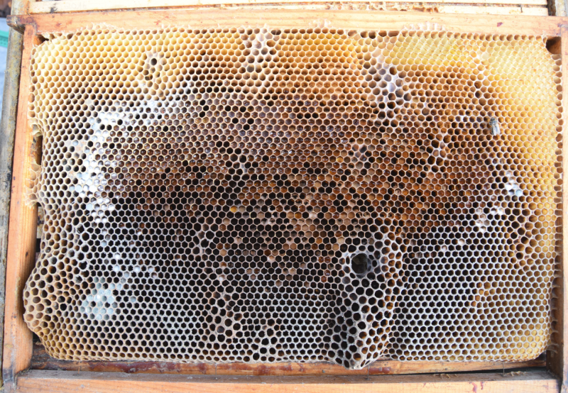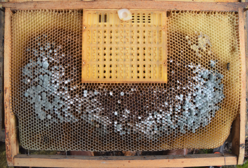a suivre !!a+oui la partie blanche est de la moisissure, mais c’est rescent, c’est depuis qu’elle est vide, et que j’ai condamnée l’entrée, il a fait vraiment humide et tres peu de jours de soleil en ce moment, bcp de brouillard etc. J’ai des photos d’autres cadres de cette ruche ou il y a carrement de la moisissure verte!