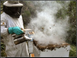 Enfume abondamment l’entrée, la fumée doit entrer vraiment dans la ruche. Si tu écoutes bien, tu entendrar le son de la colonie se modifier.