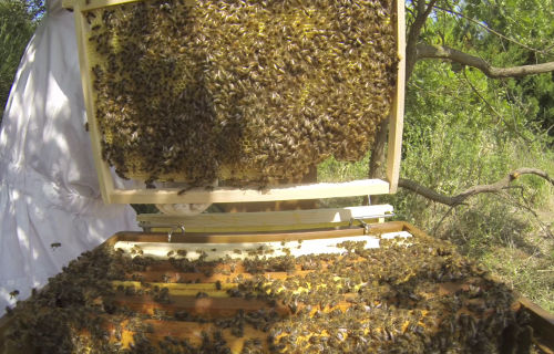 Les abeilles montent sur les têtes de cadres, forment des grappes. Je suis obligé d’enfumer de nouveau entre l’examen de chaque cadre, et c’est pas très efficace.