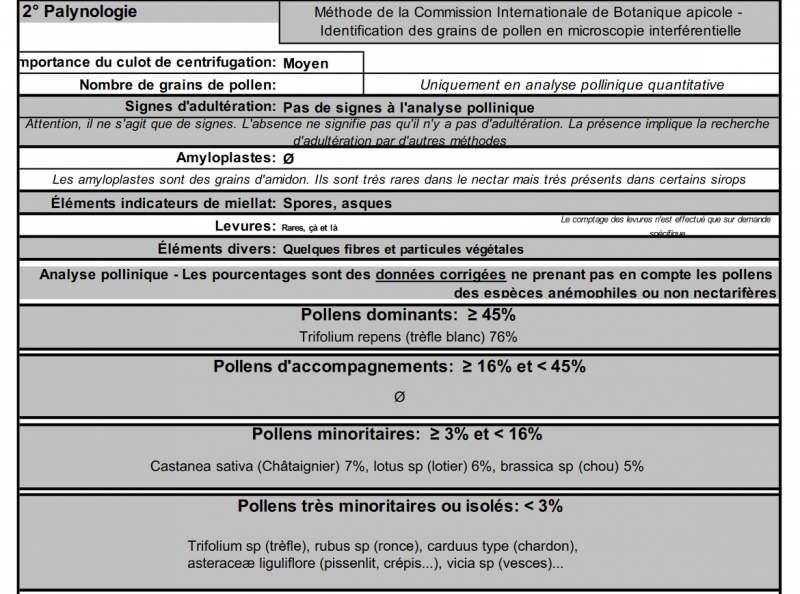 D’ailleurs je sais pas ce que veut dire spJ’ai enfin reçu l’analyse de mon miel (après 3 mois et 2 relances. mais bon, je le trouve sympa le vieux prof !) :