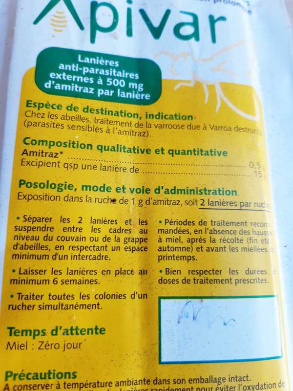 Il est noté sur l’emballage 6 à 8 semaines mais sur l’Apivar, l’info donnée sur l’emballage est erronée car on laisse les lanières plus longtemps.