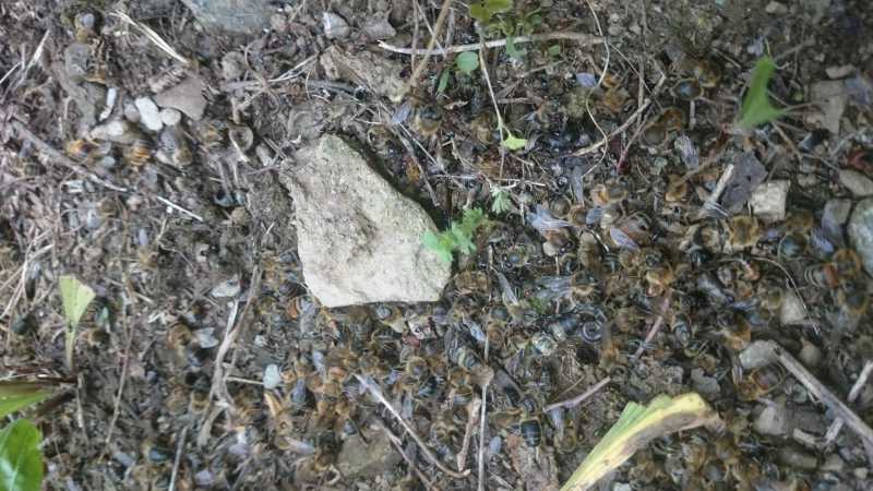 – Et ma troisième qui se trouve en piteux état !! Pour la renforcer j’ai rajouté un cadre plein de ma bonne ruche avec un max de couvain. Ca avait l’air de repartir ! Depuis c’est l’hécatombe. Elles marche au ralenti toutes faiblardes et tombe de la planche comme sans force.