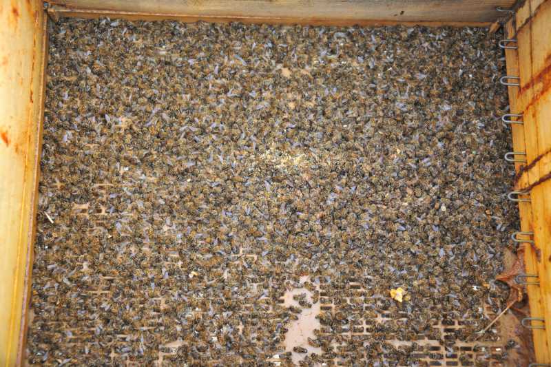 Le pote a prélevé un gobelet plein de cadavres d’abeilles et a fait un comptage varroa : 40.