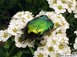 Pour le petit scarabée Cétoine, j’en ai un paquet dès le printemps, ses grosses larves blanches que l’on trouve en terre sont détruites (malheureusement) par les jardiniers qui les suspectent (parfois à raison mais il n’y a pas qu’eux) de bouloter les racines de leurs plantations… les miens s’en donnent à coeur joie pour percer les pêches et les fruits en général dont ils s’enivre… on laisse faire. D’autant que l’espèce est en voie de disparition. Comme tant d’autres. ça me fout les boules d’ailleurs…