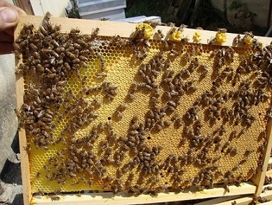 @+J’ai eu des cadres de couvain comme ça jusqu’à début septembre. Maintenant, c’est couronne de miel, pollen et le couvain occupe les 2/3 de la surface environ.