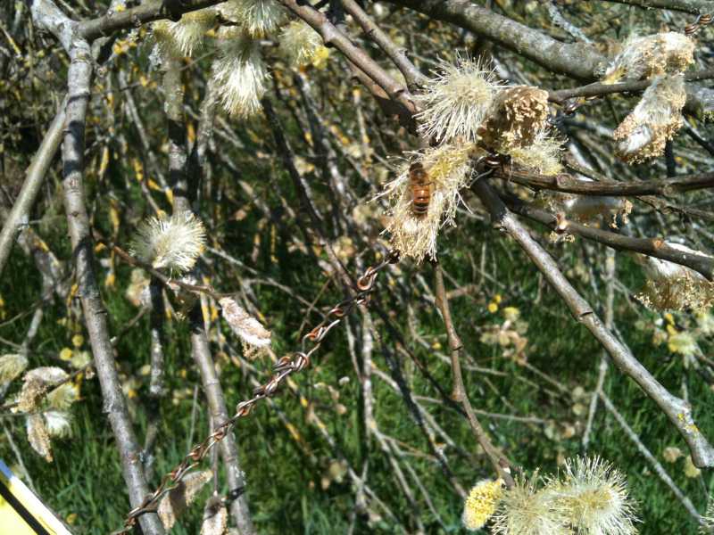 le saule marsault, c’est un peu la providence printanière pour les abeilles: pollen en très grande quantité (qu’on reconnait très bien à sa belle couleur jaune, mais aussi à la taille énorme des pelotes qu’elles ramènent…)