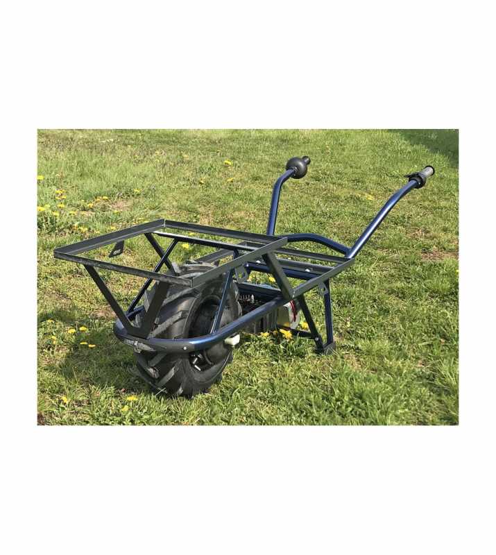 L’essieu arrière se met sous les pieds et augmente d’autant la hauteur, la brouette se trouve en position de “circulation” comme la brouette sans l’essieu, le “conducteur” se trouve en position verticale.