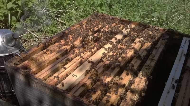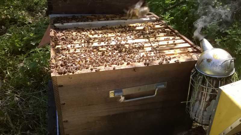 Il ne reste que les deux cadres extérieurs de la troisième hausse qui ne sont pas occupés par des abeilles !