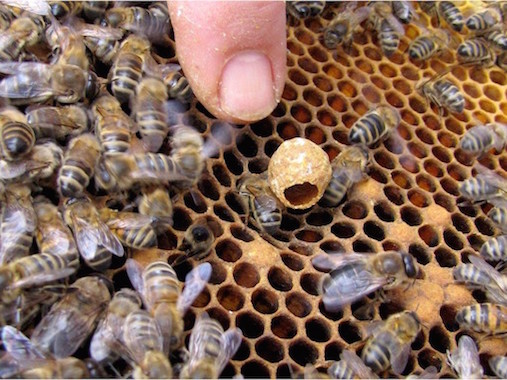 Alors dans la ruchette, aujourd’hui il y’avait beaucoup plus d’abeilles, le cadre du milieu était rempli de miel, le haut commençant à être operculé et du pollen. J’ai surtout vu 4 ou 5 cellules comme cela (photo trouvée sur le Net) qui ont attiré mon attention. Certaines avaient le fond blanc me semble t’il. C’est un début de CR ??