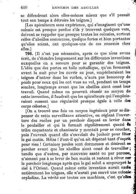 A titre d’anecdote, je joins la trouvaille citée par Langstroth au 19 ème siècle dans son livre << l'abeille et la ruche >> pour lutter contre la teigne : L’utilisation des poules déjà !!!!! Ca rappelle l’éleveur de poulets contre frelon !!!! Celà dit l’auteur rajoute que ça ne sert à rien, déjà !!!! . Un seul moyen : colonie forte disiat déjà cet auteur apicole