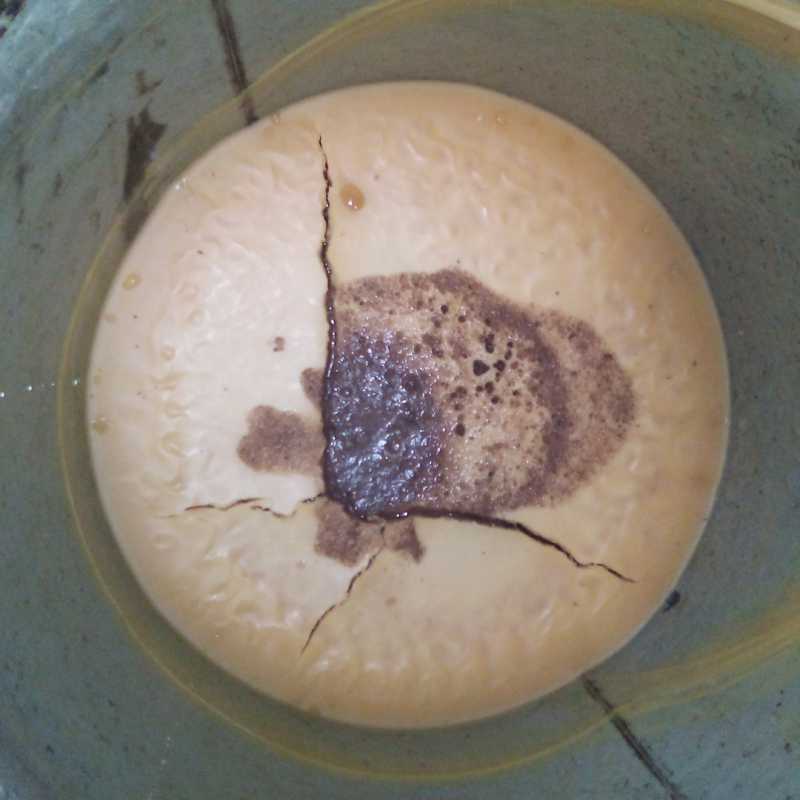 Bon la lumière n’est pas top mais voici ma marmite avec la cire d’opercules dedans…enfin la fin , que je ne prélève pas pour éviter d’embarquer la crasse qu’on voit d’ailleurs ressortir au milieu