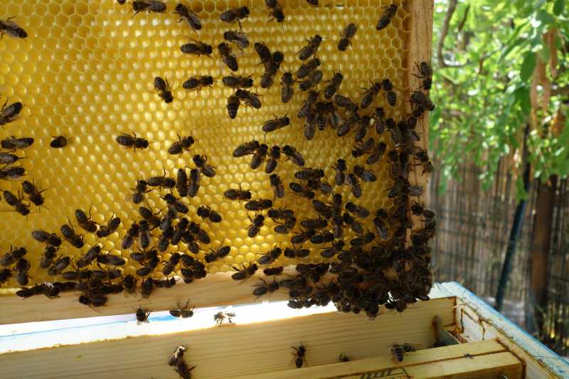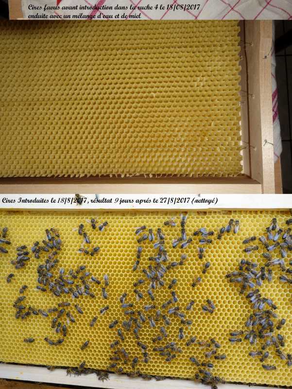 sur deux ruches, les cires favus placées en rive et en fin de saison (18 aout 2017), ont été nettoyées en 1 semaine et ont commencé a être remplies au bout de 10-15 jours. Au bout d’un mois et demi, elles sont toujours en cours de remplissage et comblées à moitié.