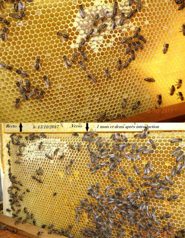 En revanche, une cire a été placées prêt du couvains le 18 aout 2017. Le 15 Octobre 2017, le cadre est entièrement rempli, recto-verso (aidé par un nourrissage régulier), et en cours d’operculation.
