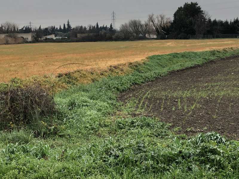 Une parcelle de fausse roquette désherbée en pleine fleus et pareil pour le fossé