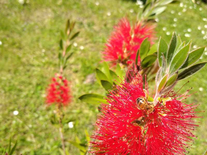 Ce callistemon est dans le jardin depuis 2 ans ,bien protégé contre le froid l hiver ( sud de Nantes). Aujourd’hui j’ai compté une quinzaine d abeille.elles en raffolent.