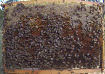 Les cires sont un peu noires. Sur la photo du dernier cadre, je ne vois pas bien, mais il me semble que les opercules ne sont pas les mèmes que sur le couvain fermé des autres ruches. Plus bombés, comme qui dirait.