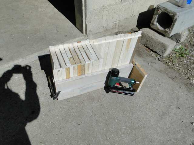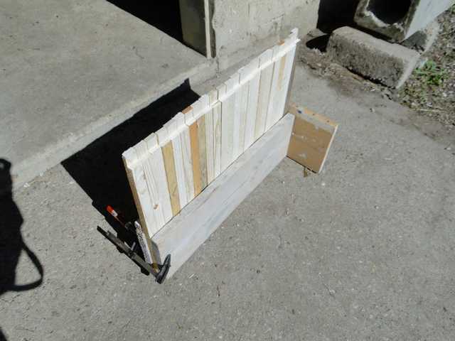 Je mets déjà tous les dessus de cadres entre ces deux planches, çà tient debout avec la planche de gauche clouée perpendiculairement aux deux autres.
