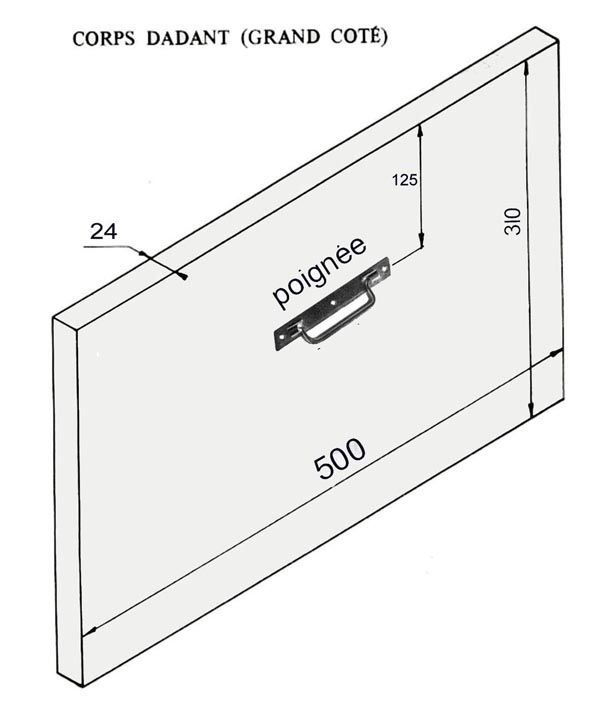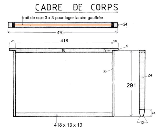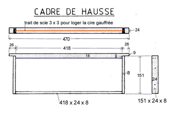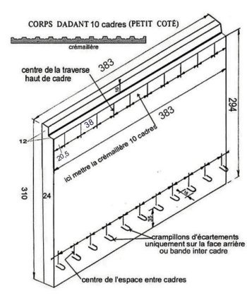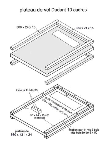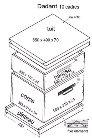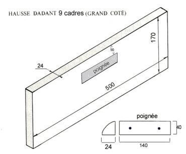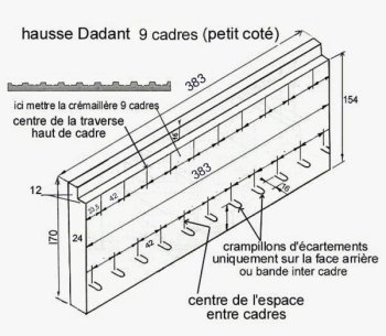 et 30 ou 31 de haut ce qui donne de la place à une séparation planche couvre cadre grille à reine faux bourdons pour les haussej’ai cherche un peu et à part des changements d’épaisseur de bois pour les tenons qui descendent (profondeur) les dimenssion de la construction semble bonne sinon je l’aurais pas fait