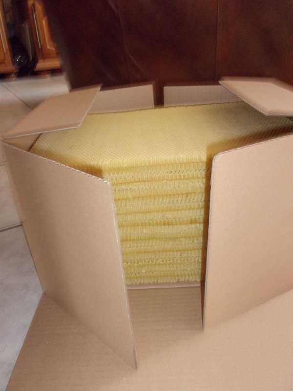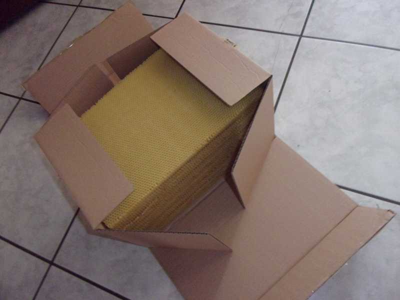 la mise en place sur cadre est très facile (en faisant chauffer les fils), j’avais peur mais non, cela est simple et se prête parfaitement au montage, il faut juste respecter le sens des alveoles. pour le moment tout les reste au frigo pour la conservation même si les cires paraissent a la fois fragiles et robustes