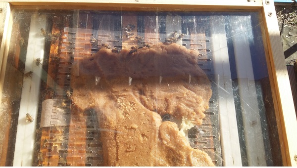 A part le fait qu’on voit parfaitement quand les abeilles vont manquer de carburant et le plaisir de les voir sans les déranger, l’avantage c’est que,quand je verrai la cire blanche, je saurai quand il faudra leur donner de l’espace et/ ou poser les hausses.