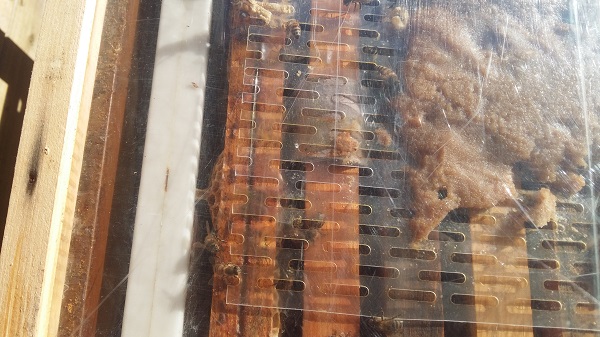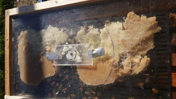 On voit parfaitement les abeilles et à quel rythme elles consomment le candi. Elles semble ne le manger que par les bords et pas par en dessous, d’ou la nécessité de leur laisser cet espace de 12 ou 8 mm.C’est pareil pour les ruchettes à part que là j’ai prévu le trou pour le nourrisseur Anglais.