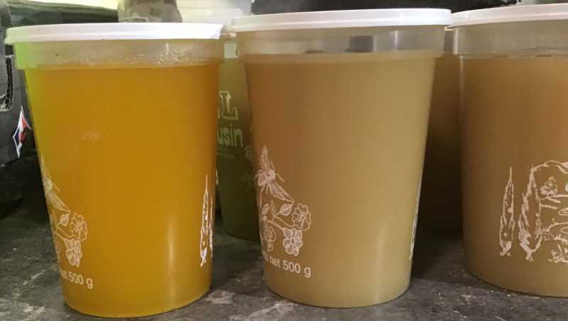 C’est une cristallisation très fine, le miel a une consistance crémeuse, est très parfumé, d’une couleur marron pâle.