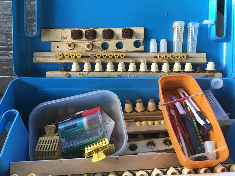 contrôle dimanche.Bonsoir , j’ai trouvé une ruche orpheline , des cr sur quatre cadres , toujours populeuse j’ai rajouté un cadre de ponte fraîche d’une autre ruche ( œuf droit ) et aussi un cadre de greffage il y a deux jours , se soir j’ai sorti le cadre de greffage et greffer la première barrette , dans une autre ruche j’ai prélevé un cadre de couvain , trouvé les bonnes larves , arasé avec le couteau , la plume dans la bouche , ( j’avais oublié mes lunettes grossissantes
