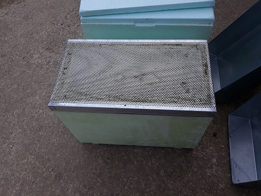 Et voili, si vous ne voulez pas “faire cuire” vos colonies en ruchettes polystyrène, indispensable d’utiliser ce type de couvercle pendant les périodes de claustration. Par contre ce n’est pas de l’inox, mais du galva……..