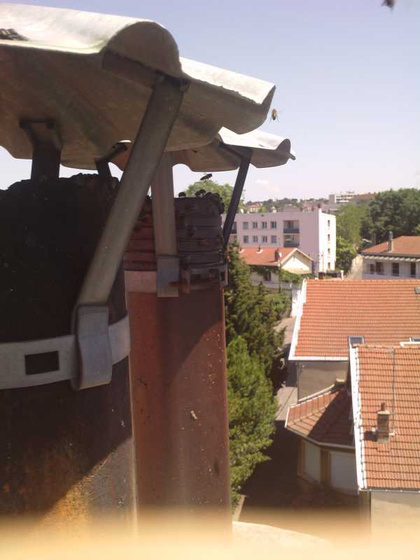 J’ai été appelé pour cet essaim qui n’a pas le vertige : il est dans une cheminée sur le toit d’un petit immeuble de trois étages (R+3).