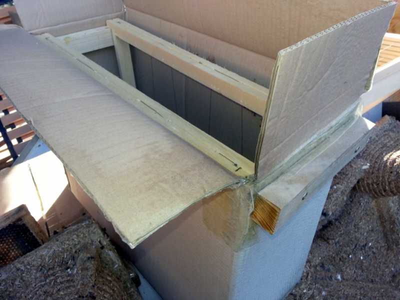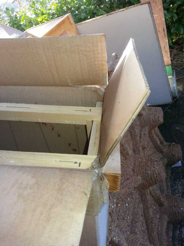 La caisse carton!! Il faut trouver une caisse en carton entière ou découper/ assembler assez grande pour contenir quelques cadres bâtis et gaufrée. Vous faites une entaille pour l’entrée et c’est partis!!