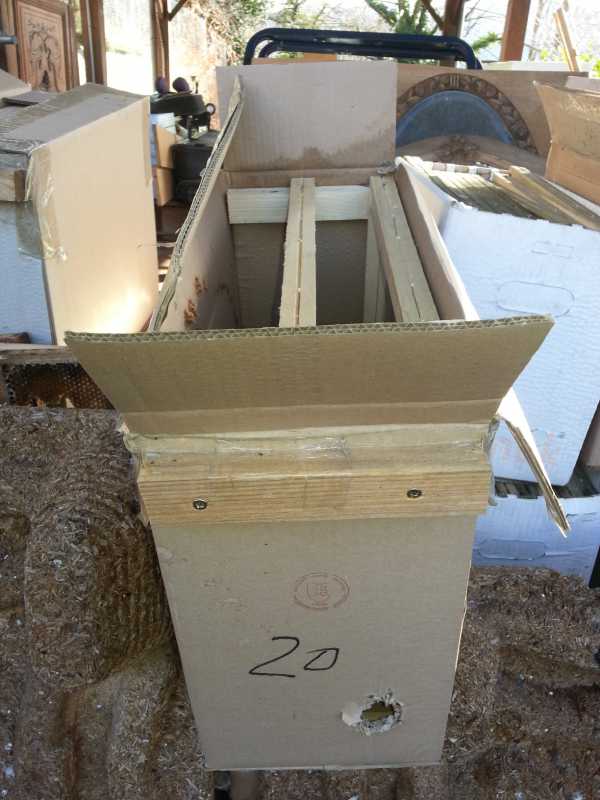 Tu visses sur la partie haute du carton et de chaque coté deux tasseaux de bois ensemble en prenant en sandwich le carton. Ceux-ci vas permettre de faire tenir les cadres droit. Tu ajustes ensuite les cadres pour avoir un écartement suffisant pour laisser les abeilles circuler. La largeur du carton est indifférente car selon ce que tu trouves, tu pourras placer 3 à 5 cadres par carton.