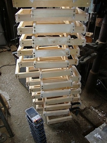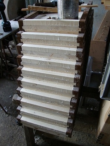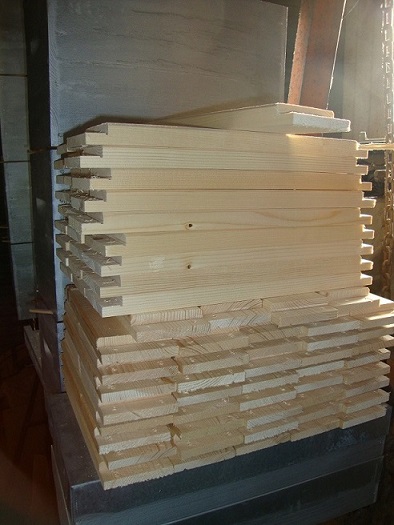 La première photo, la partie centrale est composée de plusieurs éléments en bois qui sont collés ET vissés en eux, la partie plastique est juste là, en montage provisoire pour s’assurer que tout est à la côte. Ensuite les côtés sont retirés, puis l’ensemble du bois est peint, on pourrait aussi le tremper dans de la cire micro. Puis une fois sec, les côtés sont repositionnés pour l’assemblage final avec 5 vis de 4 X 20 par côté. Le gros avantage c’est que les parties qui sont inaccessibles en plateau 100% bois, sont entièrement peintes, la résistance à l’humidité-pourriture et sans commune mesure en comparaison des éléments traditionnels. Ce sont des plateaux pour des ruches 7 cadres.