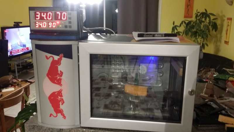 Voilà mon incubateur à reine petit modèle est fini. Fabriquė avec un petit frigo redbul vitré et 1 régulateur d incubateur relié à 2 câbles chauffants un de 15 wat pour une montée en température rapide jusqu a 33.5 degrés et une de 8 wat pour la régulation plus fine vers 34 pour éviter la surchauffe.