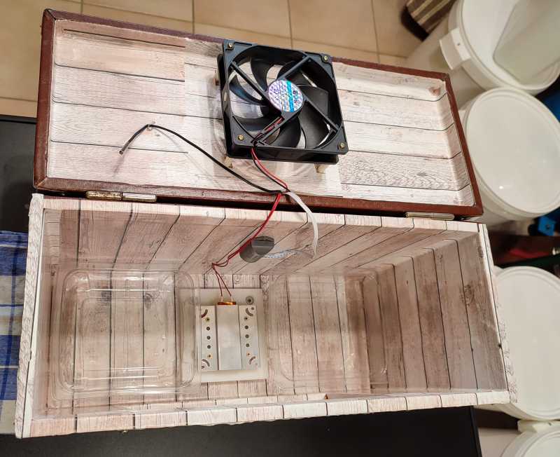Je confirme, avec le même kit j’arrive à 73%. Ma caisse est plus grande. C’est un corp de ruche. Dans un premier temps j’avais isolé tout l’intérieur mais avec l’inertie de la plaque la température continuait à monter même après l’arrêt du chauffage. Pour la réserve d’eau j’ai un petit bac avec une éponge. Par contre il faut que je fasse un trou dans la paroi pour recharger en eau.