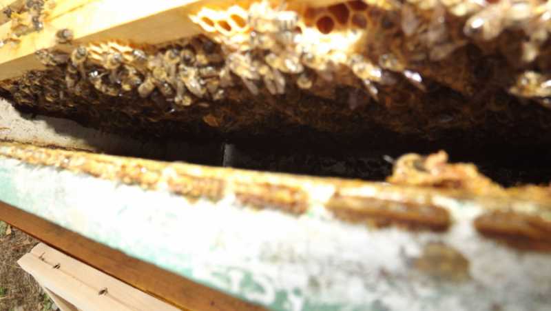 C’est les cadres de corps. La hausse à été récolté le 6 août (16.5 kg). A la suite, j’ai remis la hausse sur le corps pour léchage et je l’ai laissé dessus dans l’espoir qu’elles se remettent à faire du miel pour leur réserves.