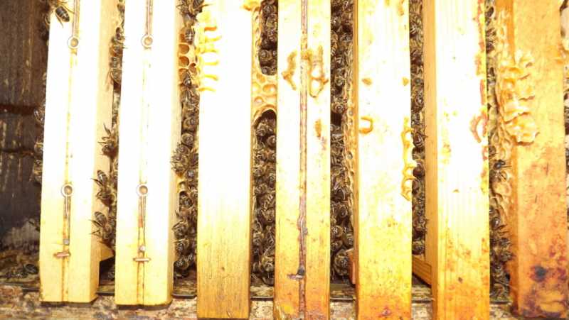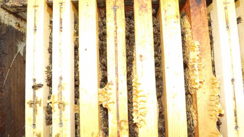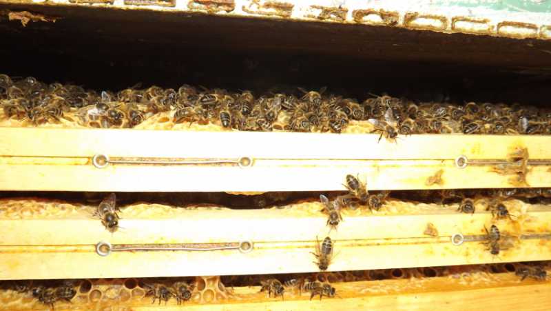 – avant dépose de chaque cadre , on envoie un peu de fumée pour refouler les gardiennes ,toujours avoir un oeil sur les abeilles qui montent pour les refouler à temps .