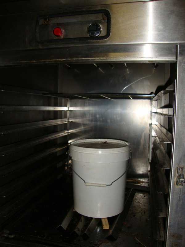 J’utilise un vieux congélateur bahut dans lequel je mets le sceau sur cales pour que l’air chaud passe également dessous et à l’aide d’un radiateur soufflant de Salle de Bains, je maintiens une température de 35 à 38°.