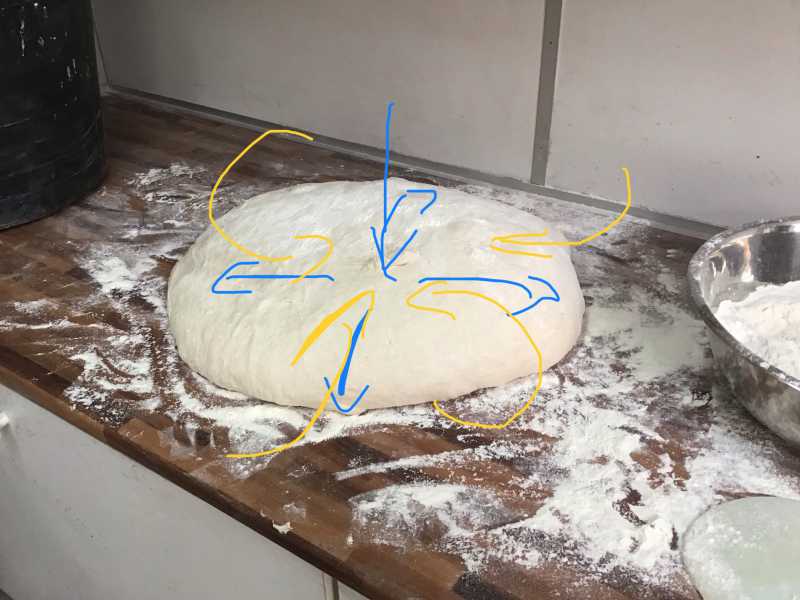 il y a 6 années et 11 moisRang: ReineMessages: 2391Nb de ruches: 15Localisation : 38500 Voiron, IsèreAlors voilà après avoir fait la pâte, une heure de pousse , puis on dégaze comme ici : on pose la pâte à plat sur un peu de farine pour ne pas coller , premier mouvement en bleu ( du milieu vers l’extérieur ) on étire puis on rabat la pâte en quatre vers l’intérieur en collant les bords par pression en jaune , puis on finit par retourner la boule et la replacer dans le bac , la pâte repose encore une heure elle gonflera +/_ encore un rabattage une heure , à la troisième heure de pousse on peut découper les pâtons , les façonner , ils reposent encore une heure