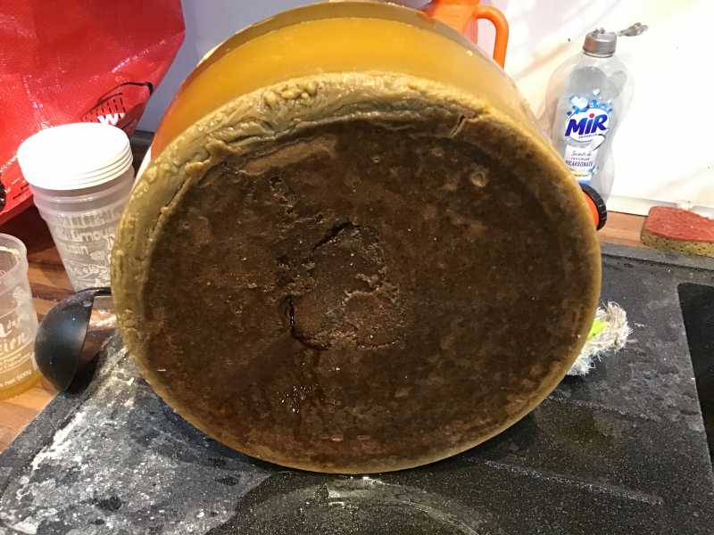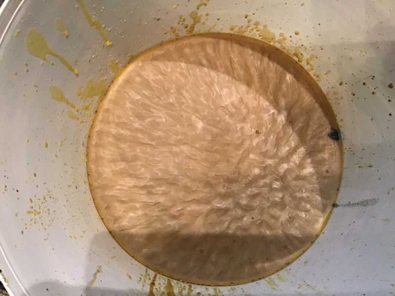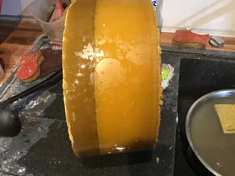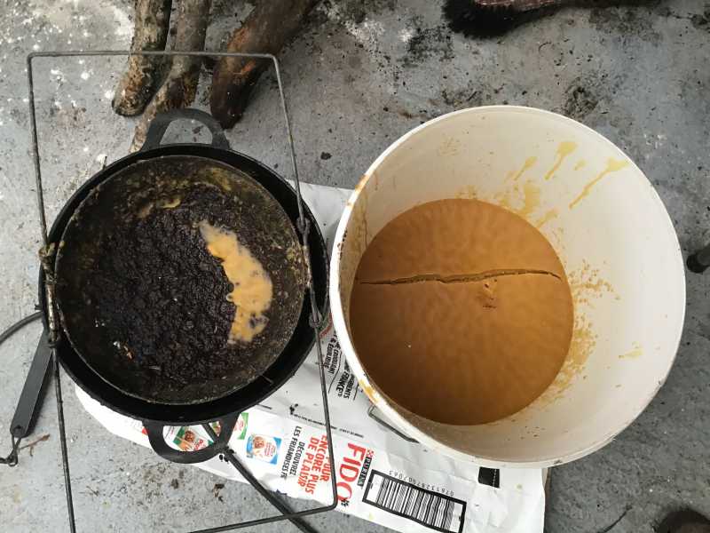 mais après toujours essayer de rentabiliser , fonte de la cire 2020 et 2019 pour faire un bloc à ma grande surprise une pureté et rapidité . Une marmite en fonte que j’approche ou écarte du feu ou un moule en aluminium dans le four , une passoire et un sceau en plastique