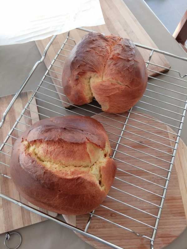 Amélioration de la recette de base ,ainsi que des moules en papier sulfurisé et 4 agrafes ,toujour en torsade suivant la largeur du moule on monte ou étalé la brioche avec un levin de 12 h ( farine 500gr,levure 20gr,lait 20 cl ) le tous battu à la main avec la même technique que le pain ,laisser reposer 3 heurs puis rebattre en ajoutant de la farine jusqu’à avoir une pate a boulé ,repos ,le lendemain cisailler le paton ( ciseaux ou couteaux ou spatule ,rajouter 6 oeufs,140gr de sucre,125 gr de beurre ramolli ,arôme ,20 gr de sel en fin de pétrissage ,à se stade suivant farine il faut en rajouter pour que la patte puisse être plier et faire des clés ,nouveau repos 3 h ,puis on plit comme une baguette ( clé ) en porte feuille et on pratique un allongement ,si sa colle tros un coup de farine ( toujour une farine tamisé ,passoire fine ) on torsade 2 longueur sur la plaque de cuisson ,repos suivant levée de 1h hier avec 30° puis dorure avec un jaune d’œuf ,un peut deau ,rajout de sucre dessus ( si pas de diabétiques ) hi hi car les brioches présentées dépasse les 500gr de farine fini