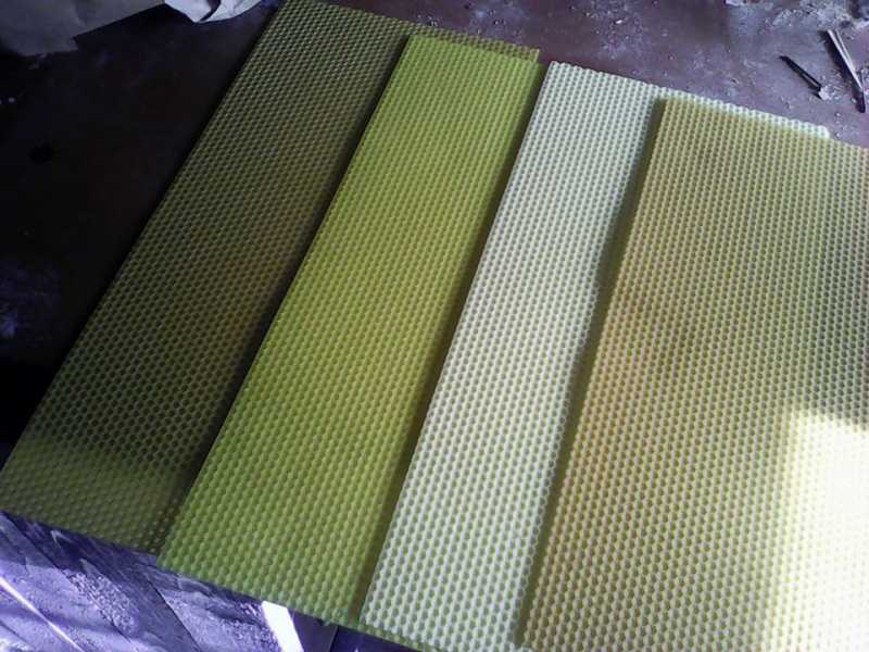 par ici les cadres en saison qui nous reviennent pas ils finissent dans le fondoir solaire sinon en tas en attendant cela fais des élevage à teigne !tout cela pour dire de la cire verte genre pollen vert c’est possible … une boulangère m’as dit que sa bougie de cire d’abeille verte sentais très bon allumée — alors peut etre achette des mèche et roule de la cire gaufrée autour et revend au kilos