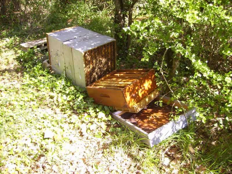 Pour la plupart, les toits avaient été enlevés et lancés à quelques mètres.Le bilan : 12 ruches renversées. Pas trop de pillage, il a fallu les remettre debout !, la plupart étaient gauches, donc transvasement.