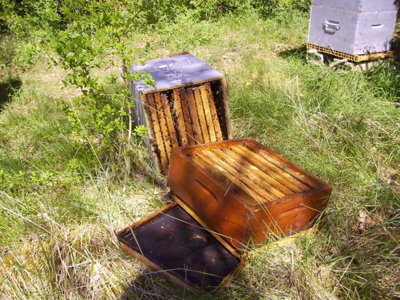 Manifestement, çà été un basculage des ruches par un ou plusieurs vandales et bien sûr les plus pleines avec 3 hausses.