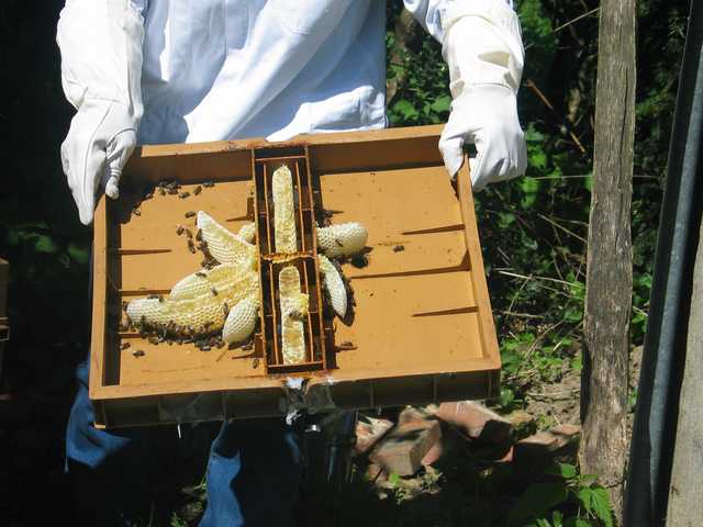 hier je suis allé chez un pro il etait en train d abattre un vieux chene tout creux et il avait pas vue qu il y avait une colo dedans, pas grosse mais y avait du couvain!!!!et pas mal pour la grosseur de l essaim.