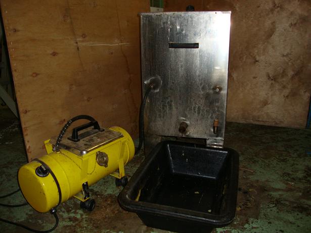 Une chaudière rectangulaire, modifiée, une décolleuse à papiers peints et une gamate de maçon. Je l’utilise pour les cadres de corps, de hausses, et ainsi que pour les opercules que je vide dans le panier. Pour moi, c’est économique, sécurisé, efficace, programmable à l’avance etc.etc. QUE DU BON!